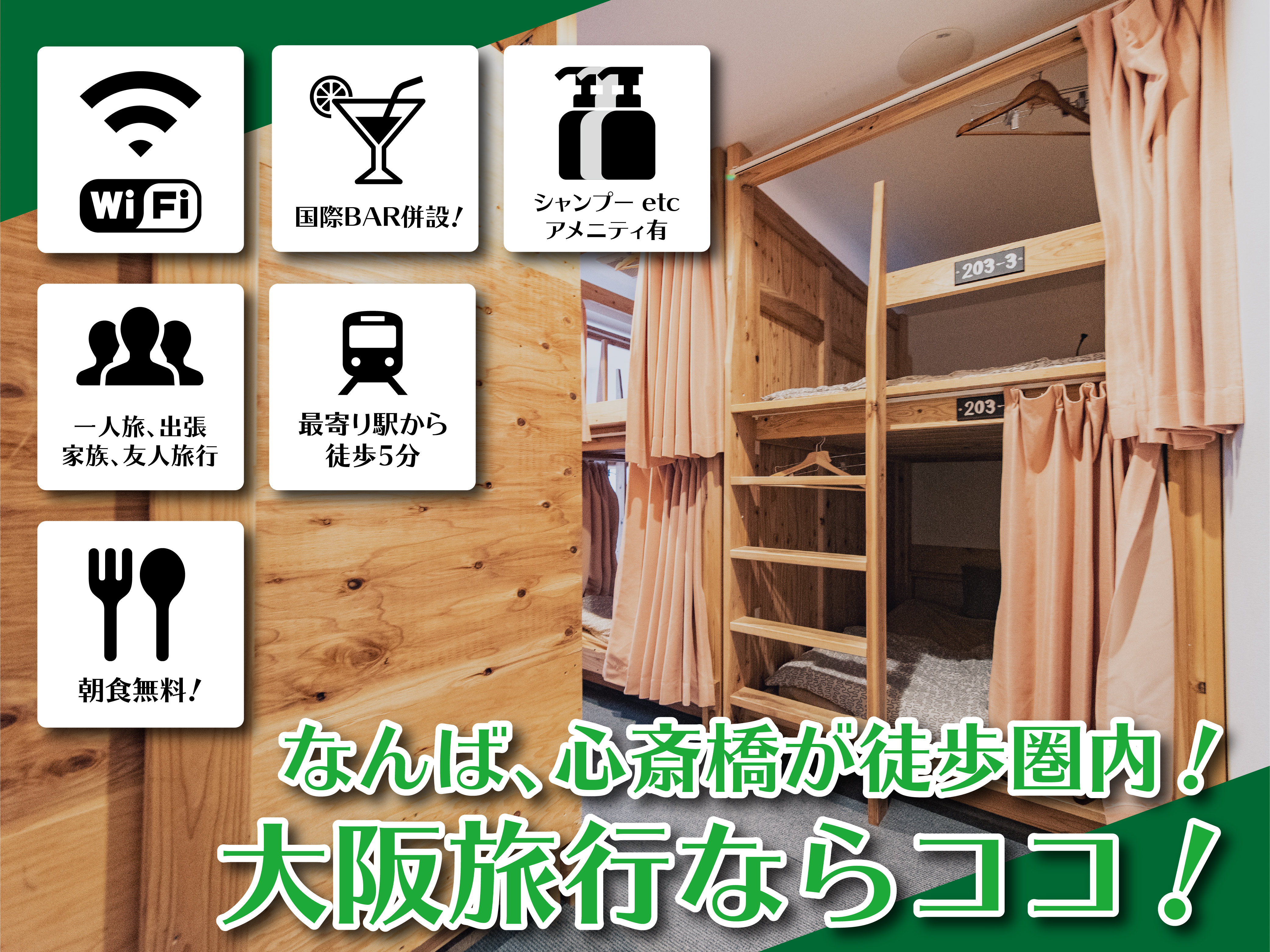 大阪・ナンバ道頓堀エリアの宿舎 サクラゲストハウス道頓堀 です! 当店は難波の地下街を通れば、関空からほとんど雨に濡れることなく来ることができます。 ナンバ駅から最も近い段兼用ホステルです。 大阪で人気のゲストハウスのランキングです。アクセスページ ACCESS 5つの駅を利用出来る最高にアクセスのいいゲストハウス 難波エリアから徒歩10分 大阪難波にあるゲストハウス 難波、新世界周辺、大阪の中心のどちらへも徒歩で行ける場所にあります。また徒歩10分以内に5つ駅があり、大阪市内への観光、京都、奈良、関西空港への大阪(難波)のゲストハウス「ファントコ」┃Osaka (Namba)Guesthouse┃Funtoco Backpackers Namba – 大阪の中心、難波にあるGuesthouse,cafe&Barです。